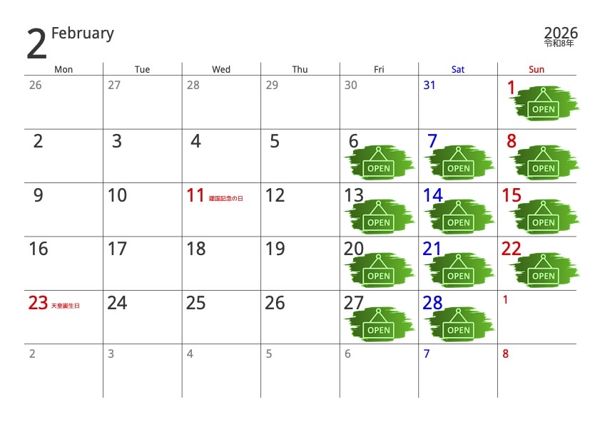 *2月はカレンダー通り(金・土・日)の営業となります。